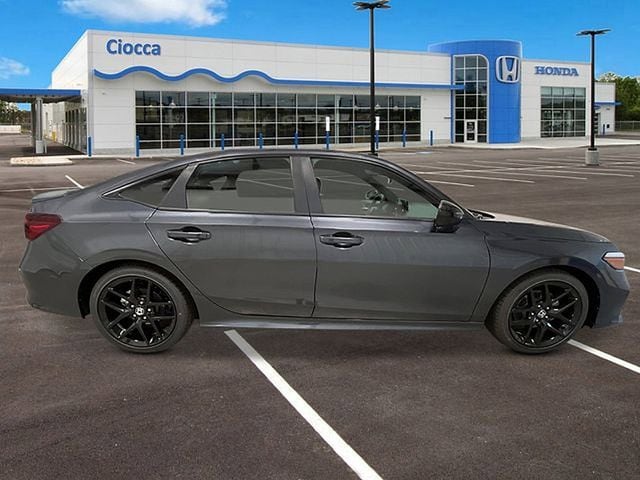 The 2026 Honda Civic Sport Sedan serves as the athletic entry in the non-hybrid lineup, powered by a 2.0-liter four-cylinder engine that delivers 150 horsepower and 133 lb-ft of torque. Paired with a continuously variable transmission (CVT), this trim includes a 3-Mode Drive System (ECON/Normal/Sport) and steering wheel-mounted paddle shifters for a more engaged driving experience. The exterior is defined by a bold, blacked-out aesthetic featuring 18-inch gloss-black alloy wheels, matte-black window trim, a chrome exhaust finisher, and heated power side mirrors with gloss-black caps. Inside, the cabin features sport-specific upgrades such as racing-inspired sport pedals, a leather-wrapped steering wheel, and a leather-wrapped shift knob. Standard technology includes a 7-inch color touchscreen with Apple CarPlay and Android Auto integration, a 180-watt 8-speaker audio system, and Smart Entry with Walk Away Auto Lock. For safety, the Sport trim comes equipped with the Honda Sensing suite, which includes adaptive cruise control with low-speed follow and a standard Blind Spot Information System with a rear cross-traffic monitor.